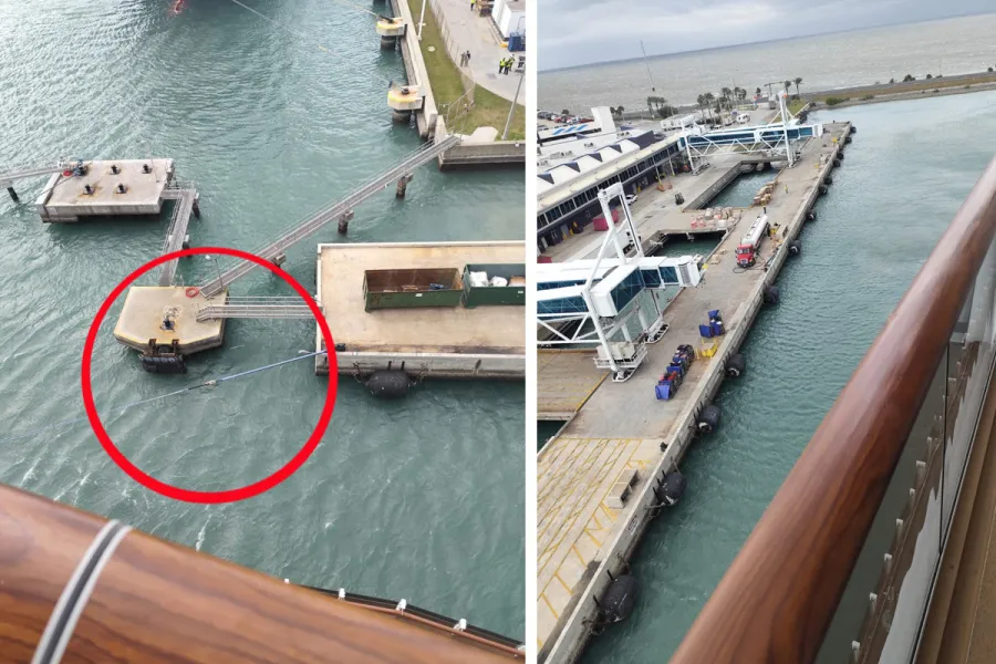 Footage posted shows the moment the ship pulled away from the dock as port teams responded. Tugboats quickly moved in to assist, helping keep the vessel under control and guiding it back toward a safe position alongside the pier. Witness messages from the scene described very strong winds outside and said operations were disrupted during embarkation, including a stop in luggage delivery while the situation was handled.
