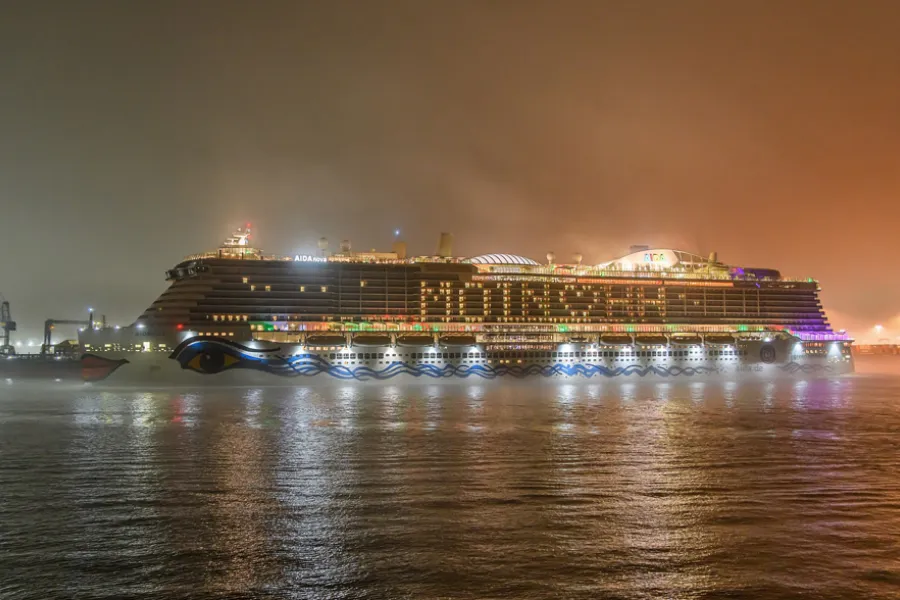 Today AIDAnova, the 10th cruise ship in the Aida fleet to restart cruises, arrived at the port of Hamburg for the first time. As the ship entered the port the crew onboard sent a lighting message “Moin ❤ HH” to the people of Hamburg along the Elbe River. Since the arrival in the Hanseatic city, the final preparations have been made to welcome the first guests tomorrow, December 14, 2021. AIDAnova is the first cruise ship in the world operated 100% with low-emission liquefied natural gas (LNG). The vessel received Blue Angel seal by the German government for an environmentally friendly ship design two years ago.