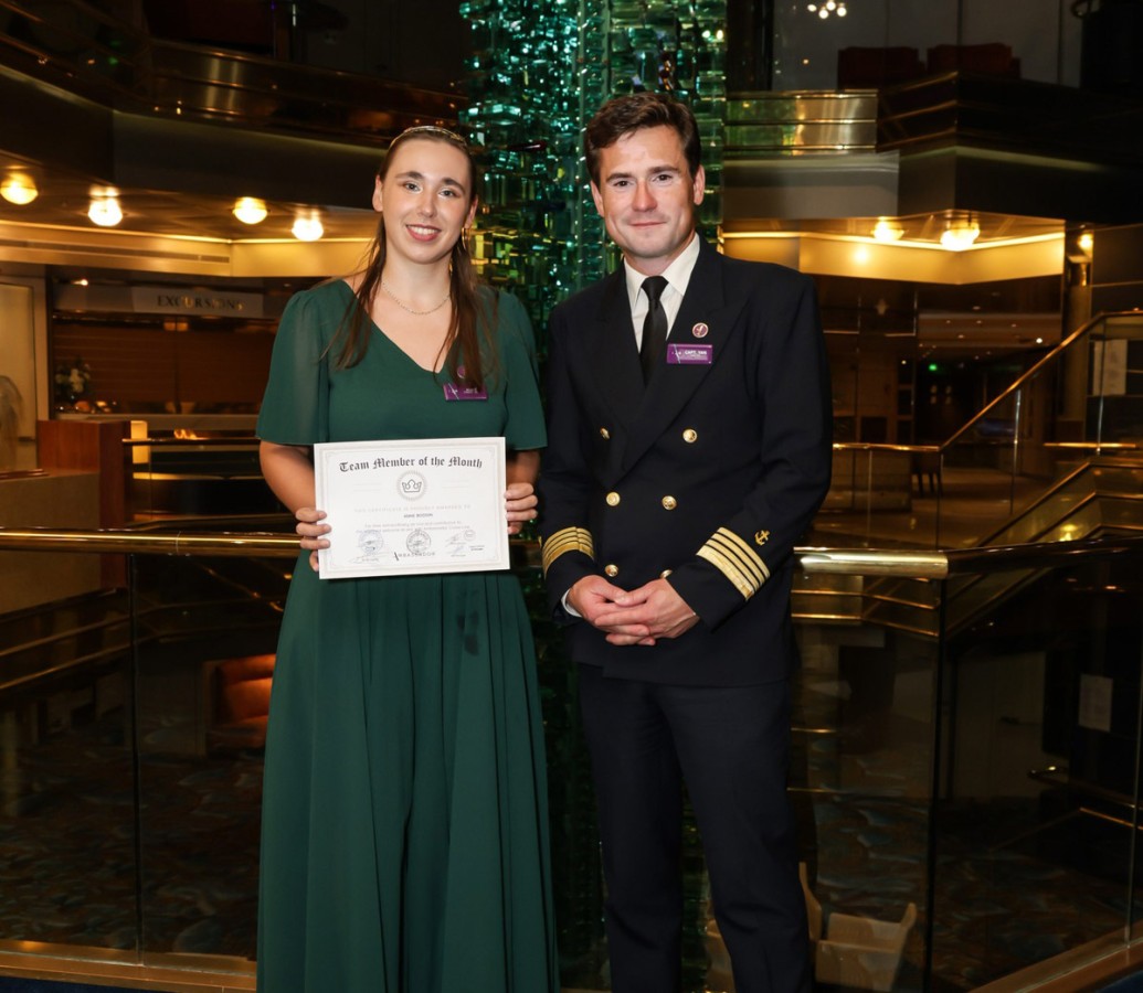 Anne Boddin, an Insight Host, and Moin Mohammed, an Assistant Electrician, were recognized for their dedication and contributions to the onboard experience. Anne was praised for her creativity, enthusiasm, and commitment to delivering memorable moments for guests, while Moin was recognized for his technical expertise, reliability, and vital role in maintaining smooth operations behind the scenes.