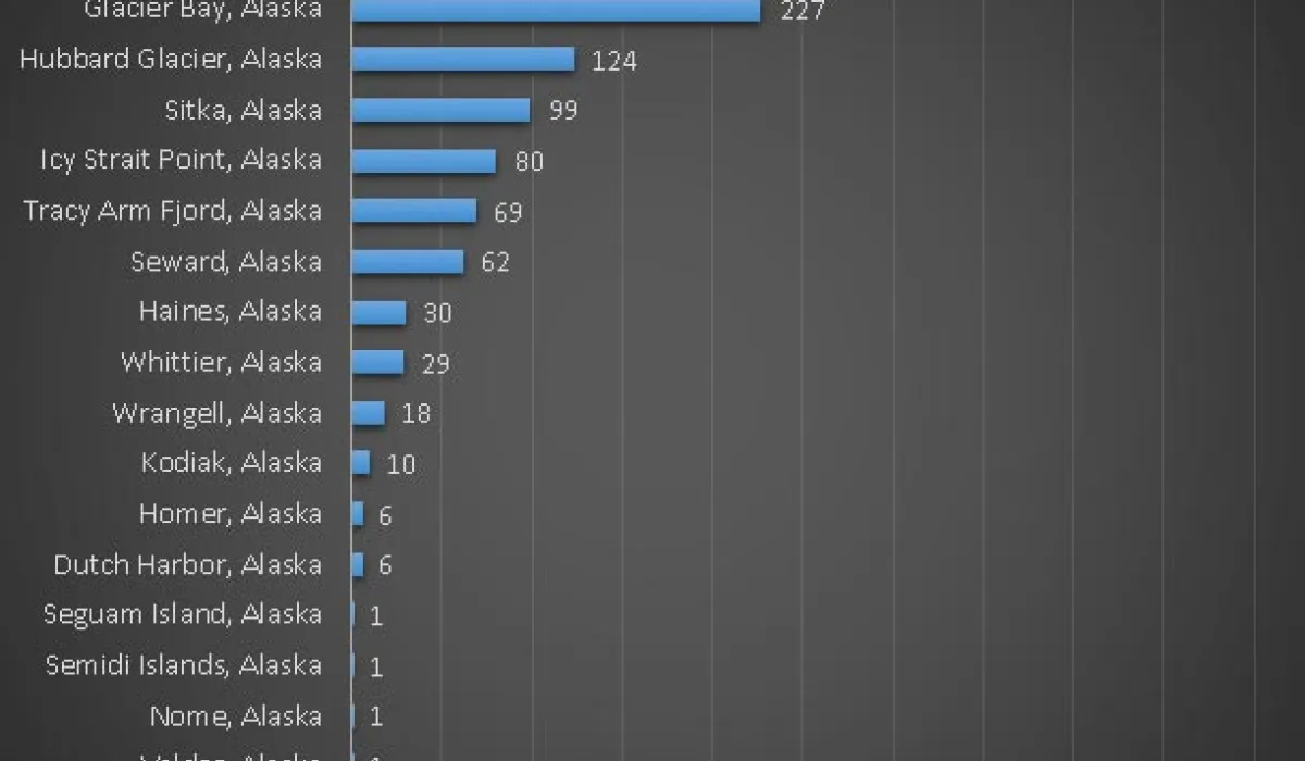 The following analysis shows how many cruise ships will arrive in ports in Alaska in 2017. Divided into three categories the presented charts give a graphic presentation of how many cruise stops are expected in each port, which cruise ships will be deployed in Alaska, and the cruise lines with most cruise arrivals for the entire 2017. Please note, this is unofficial statistics, intended for informative use only. Data used to create cruise industry trends is combined from the major cruise lines itineraries.