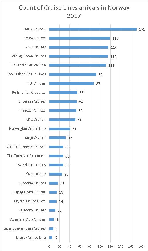 - AIDA Cruises is expected to make 171 stops in Norway with a total of 7 cruise ships.