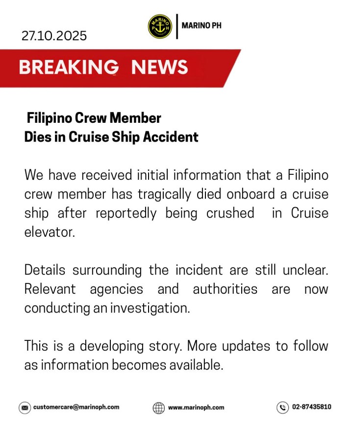 Marino PH reported that the crew member involved was from the Philippines and was fatally injured in an elevator accident. Official findings have not yet been released, and multiple agencies are now conducting investigations to determine exactly what happened.