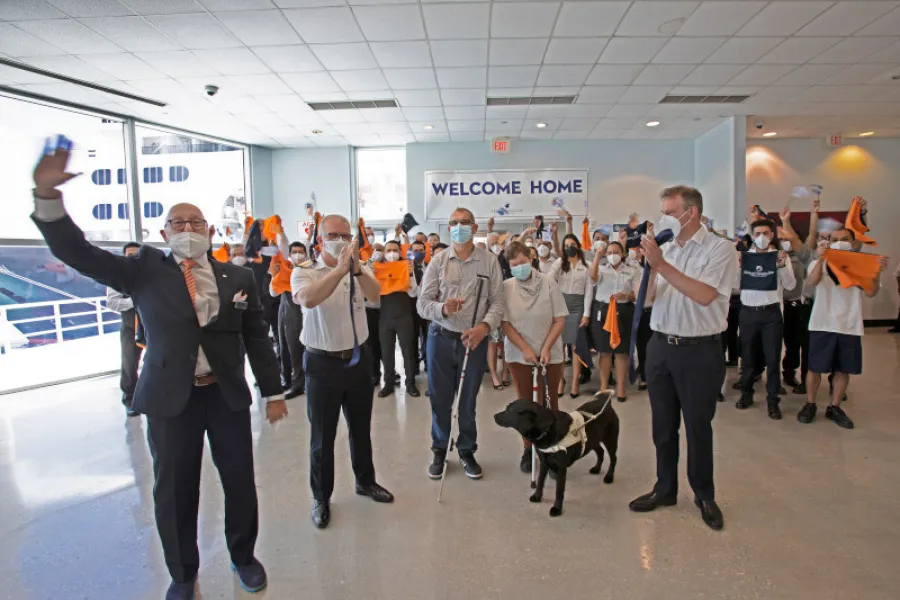 To celebrate the occasion, Holland America Line held a ribbon-cutting ceremony in the terminal to open embarkation, attended by the ship's captain and senior officers, with flag-waving fanfare from team members lined up to greet guests as they boarded the ship.