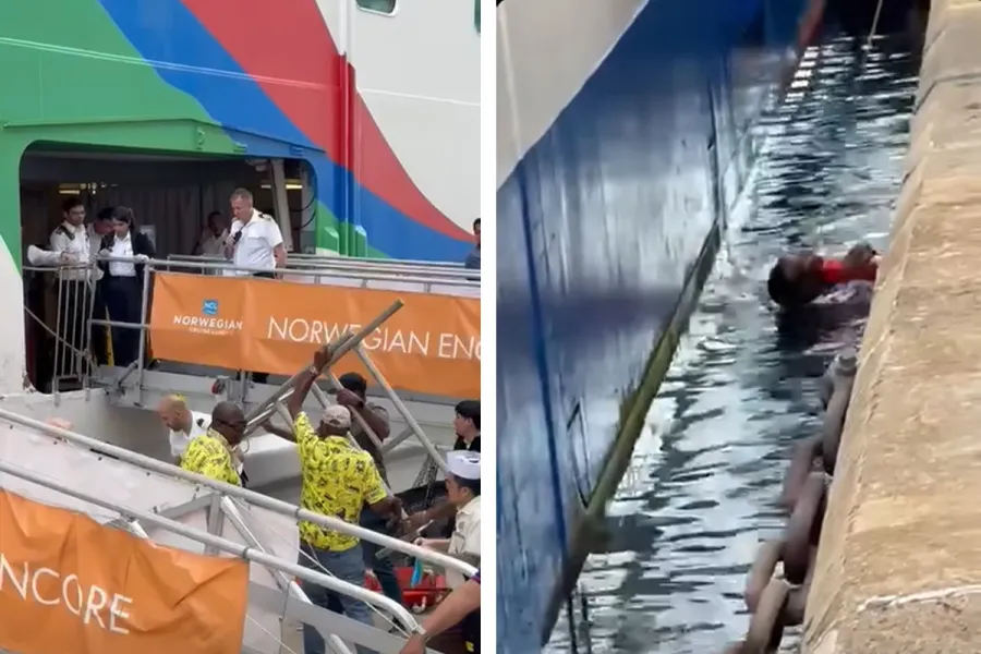 According to social media posts, witnesses say the man appeared to have been on the dock or had just stepped onto the ramp toward the cruise ship when he suddenly slipped and fell into the water. In the video, he can be seen holding onto a buoy while struggling to stay afloat as bystanders call for help. People nearby quickly located a ladder and worked together to pull him out of the water.