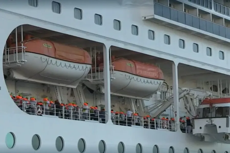 Three lifeboats each accommodating 150 people were lowered in real maritime evacuation mode. Crew personnel boarded, pulled away from the ship’s side, and maneuvered in port waters under the escort of a large Coast Guard SAR vessel. The design of the exercise mirrored what would occur if the ship were anchored in internal waters under Ancona’s jurisdiction, rather than moored in port.
