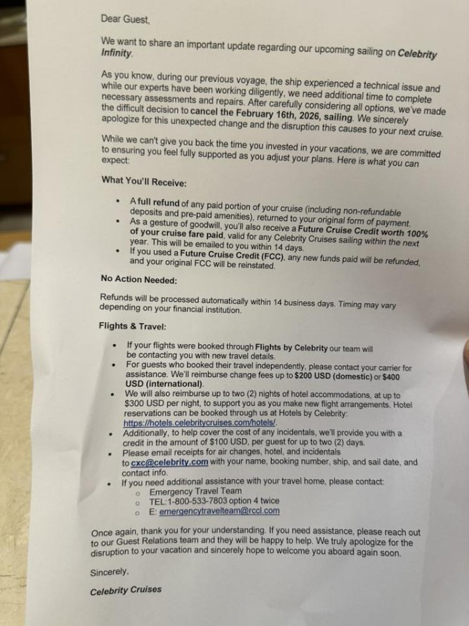 Following the incident, Celebrity Cruises informed guests booked on the ship’s next scheduled voyage departing February 16, 2026, that the sailing had been officially cancelled.